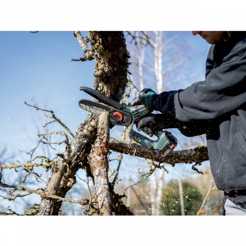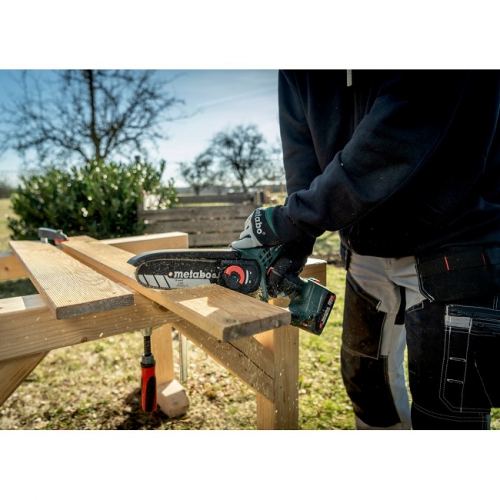 Особливістю METABO 600856500 є наявність системи автоматичного змащування ланцюга, що подовжує термін служби інструмента і знижує необхідність технічного обслуговування. Крім того, пила оснащена системою швидкої натяжки ланцюга без використання інструментів, що спрощує її налаштування і робить підготовку до роботи максимально швидкою. Ергономічна форма корпусу та зручна прогумована ручка забезпечують комфортне утримання та знижують втому навіть при тривалій роботі.
