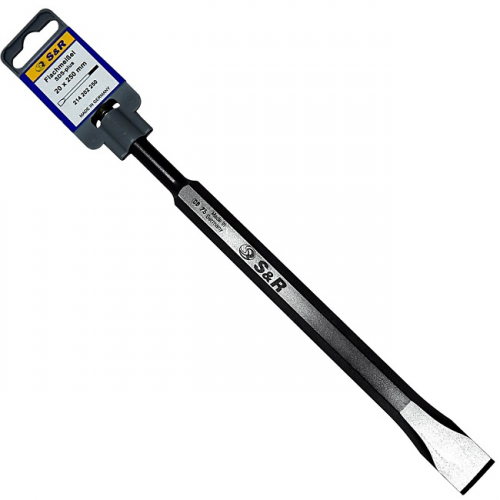 Зубило плоске S&R 214202250 застосовується для виконання робіт по бетону, кам'яній кладці, асфальту і інших будівельних матеріалах. Підходить для відбійних молотків, перфораторів вагою від 2-х до 4-х кг з типом патрону SDS-plus в режимі удару без обертання.