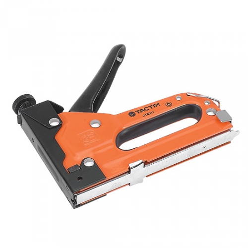 Степлер будівельний TACTIX ST00200000MT0 використовується з посиленими скобами шириною: 11,3 мм; 10,6 мм та довжиною: 4-14 мм. Степлер виготовлений зі сталі та висоякісного міцного пластику.