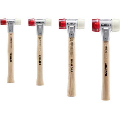 Молоток щадний BASEPLEX HALDER 3968.030 відповідає високим стандартам якості Halder. Серія BASEPLEX 3968 складається з комбінації ацетату целюлози та нейлону. Вставка з червоного ацетату целюлози є середньо жорсткою та стійкою до масла та жиру. Біла нейлонова вставка трохи твердіша за червону і більш зносостійка, допускається використання для робіт з металом, забивання цвяхів.