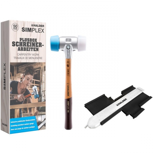 Набір інструментів HALDER 3117s004 в комплект PLUS BOX SET JOINER входить столярний молоток Halder і контурний калібр. Молоток SIMPLEX виготовлений із двома різними наконечниками. Наконечник із суперпластичного синього еластомеру — найніжніша вставка в лінійці SIMPLEX, що забезпечує надійну амортизацію під час роботи, що потребує легкого дотику. На відміну від звичайних гумових молотків він не залишає небажаних слідів.