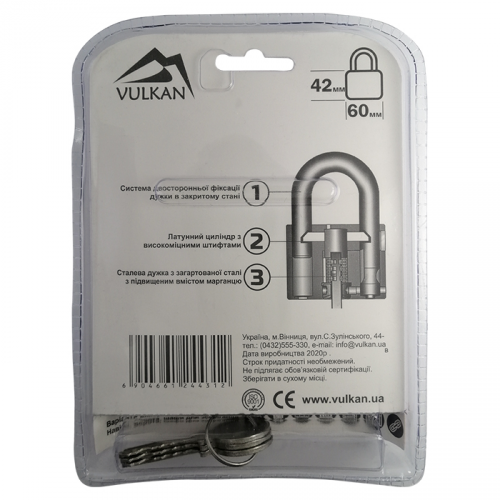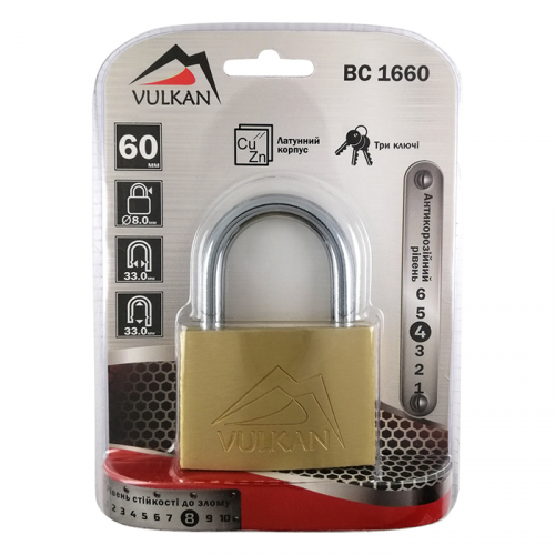 Замок навісний 60мм VULKAN BC1660 - взломостійкий, простий і зручний в експлуатації. Оснащений системою автоматичного замикання. Красивий золотистий колір легко впишеться в будь-яку обстановку. До замку додається англійський ключ (в трьох примірниках).