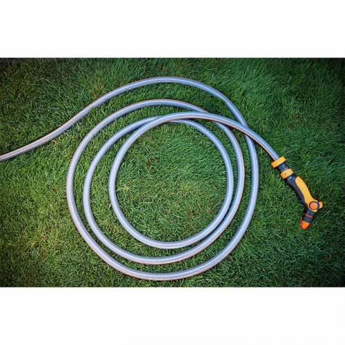 Завдовжки 20 метрів, шланг дозволяє охопити значну територію без необхідності частого переміщення джерела води. Гнучка конструкція запобігає заломам і перегинам, що забезпечує безперебійну подачу рідини. Його багатошарова структура включає армоване посилення, що підвищує стійкість до внутрішнього тиску та механічних навантажень.