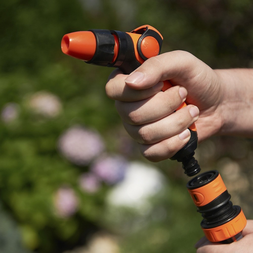 Пістолет для поливу SEQUOIA SWPSN8 легко підключається до стандартного шлангу завдяки універсальному штуцеру, що забезпечує надійне з'єднання без протікань. Його конструкція продумана до дрібниць, що дозволяє ефективно регулювати витрату води та зменшити її споживання.