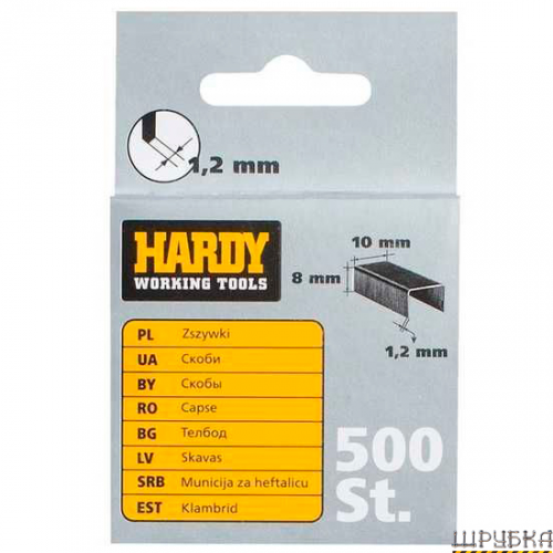 Штеплерні скоби 8мм мають висоту - 8 мм, ширина - 10мм, товщина 1,2мм. Штеплерні скоби HARDEX 2241-650008 виготовлені з високоякісної загартованої сталі.