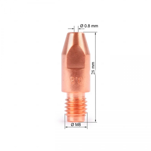Накінечник E-Cu M6x28x0.8x8.0мм RF25, RF36, MB25 ABICOR BINZEL 50130 - витратний елемент для напівавтоматичного зварювання у середовищі захисних газів (MIG/MAG), призначений для точного і стабільного подавання зварювального дроту діаметром 0,8 мм. Виготовлений із електролітичної міді (E-Cu), накінечник забезпечує високу електропровідність і чудову теплопровідність, що сприяє стабільному горінню дуги та рівномірному переносу металу.
