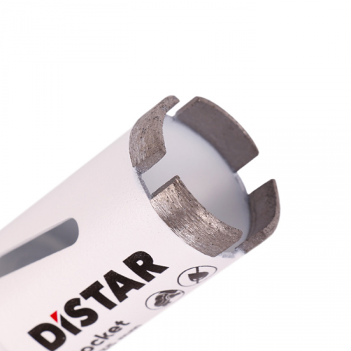 Свердло DISTAR Rocket 35 мм показує відмінні результати при сухому свердлінні керамограніту, кераміки, граніту, мармуру та інших твердих облицювальних матеріалів. Його конструкція дозволяє працювати без подачі води, що особливо зручно при внутрішніх роботах, де використання охолодження є небажаним або неможливим. Надійне кріплення алмазних сегментів забезпечує високу зносостійкість і довготривалий термін експлуатації навіть у випадку інтенсивного використання.