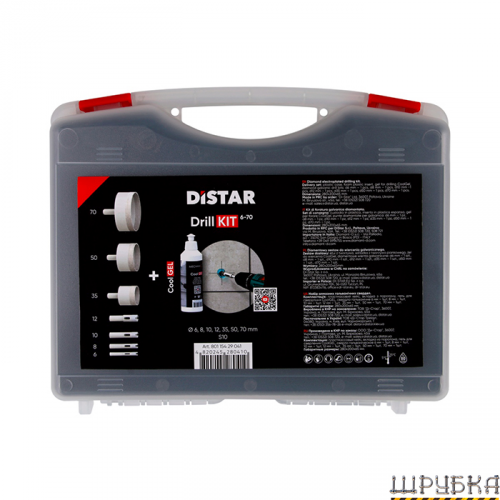Набір свердл DrillKIT 6-70мм + CoolGEL DISTAR 89568442140 - професійне рішення для майстрів, які цінують точність, ефективність і комфорт під час свердління кераміки та керамограніту. Універсальність цього комплекту дозволяє працювати з різними типами плитки, включно з твердим полірованим керамогранітом, мозаїкою, глазурованою керамікою та іншими облицювальними матеріалами.