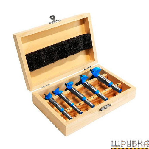 Набір складається із зручного дерев'яного футляра і 5 свердел наступних розмірів: 15 мм; 20 мм; 25 мм; 30 мм; 35 мм.