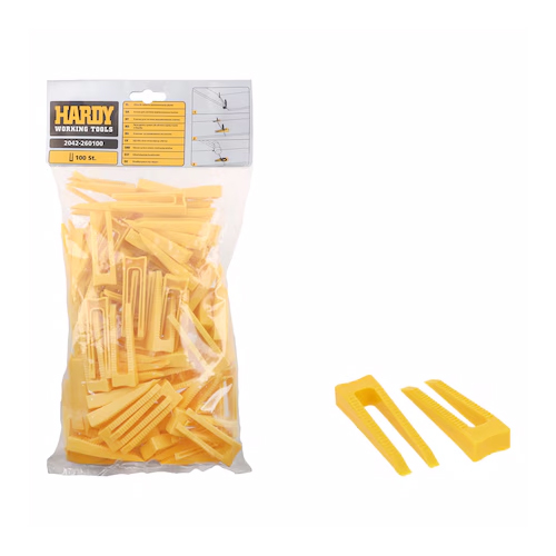 Клини для плитки Hardy 2042-260100 дозволяють майстрам зберігати точну геометрію укладки, запобігаючи зсуву плитки під час висихання клею. Завдяки цьому плиткові роботи проходять швидше, легше і без потреби в постійному контролі. Особливо корисними вони будуть у ванній кімнаті, кухні, коридорі, на терасі або у будь-якому іншому приміщенні, де важлива акуратність і довговічність облицювання.