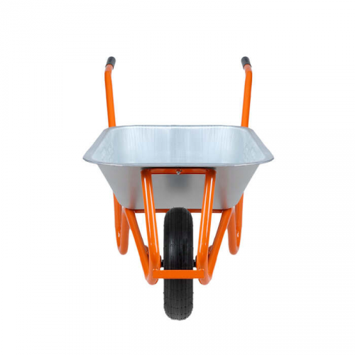 Тачка має місткий кузов об’ємом до 100 літрів, виготовлений із посиленого сталевого листа з антикорозійним покриттям. Це гарантує довговічність навіть у найсуворіших умовах експлуатації. Одне широке поліуретанове колесо з посиленими підшипниками та металевими дисками дозволяють вільно рухатися навіть нерівною поверхнею, не бояться проколів, не вимагають підкачування і значно знижують навантаження на користувача. Каркас виготовлений із надійної сталевої труби, що витримує великі навантаження та забезпечує стійкість конструкції.