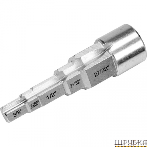 Розміри ступеневого ключа: 3/8 дюйма (9,6 мм); 29/68 дюйма (11,6 мм); 1/2 дюйма (12,6 мм); 21/32 дюйма (16,4 мм); 27/32 дюйма (21 мм) з приводом 1/2 дюйма.