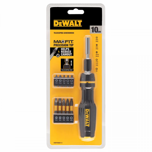 Викрутка - набір FULL FIT Telescoping, зі змінними бітами DeWALT DWHT68001-0 - універсальний інструмент для швидкого та зручного виконання широкого спектра монтажних і ремонтних робіт. Завдяки телескопічному подовжувачу ви легко дістанетесь до важкодоступних місць, а змінні біти забезпечать сумісність із більшістю поширених типів кріплень.