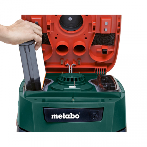 Цей будівельний пилосос Metabo ідеально поєднується з електроінструментами. Він має розетку з автоматичним запуском, яка вмикає пилосос одночасно з підключеним інструментом (дрилем, шліфувальною машиною, перфоратором тощо). Така функція значно підвищує зручність роботи та зменшує кількість пилу під час свердління, шліфування чи різання.