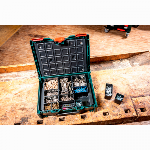 Органайзер Metabo metaBOX 118 (626897000) - сучасна система зберігання для інструментів, оснастки та дрібних комплектуючих, яка допомагає підтримувати порядок у майстерні, на будівельному майданчику або під час виїзних робіт. Компактний та міцний органайзер Metabo metaBOX створений для професіоналів, які цінують зручність транспортування, швидкий доступ до інструментів і надійний захист вмісту.