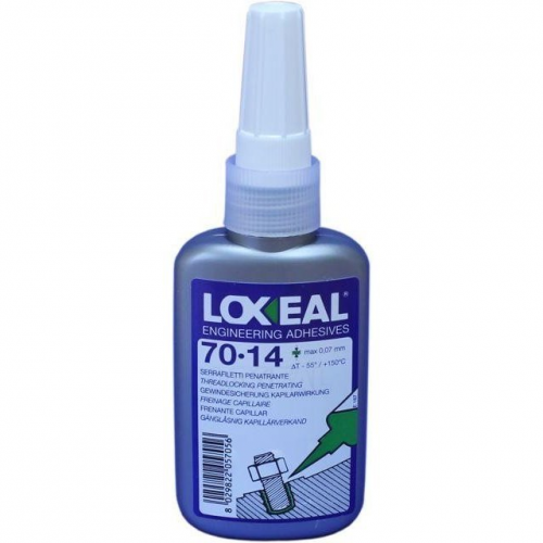 Фіксатор різьби LOXEAL 70-14 50мл - однокомпонентний клей високої міцності для кріплення та фіксації вже зібраних різьбових з’єднань, капілярний продукт. Має чудову проникну здатність за рахунок дуже низької в’язкості, усуває пористість металевих поверхонь. Стійкий до тепла, корозії, вібрації, води, газу, нафти, вуглеводнів та інших хімічних речовин. Одночасно фіксує та герметизує різьбу.