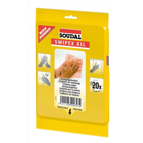 Очищаючі серветки SOUDAL Swipex 20шт. - міцні та ефективні вологі серветки для видалення свіжих хімічних речовин з рук, інструментів та інших твердих поверхонь.