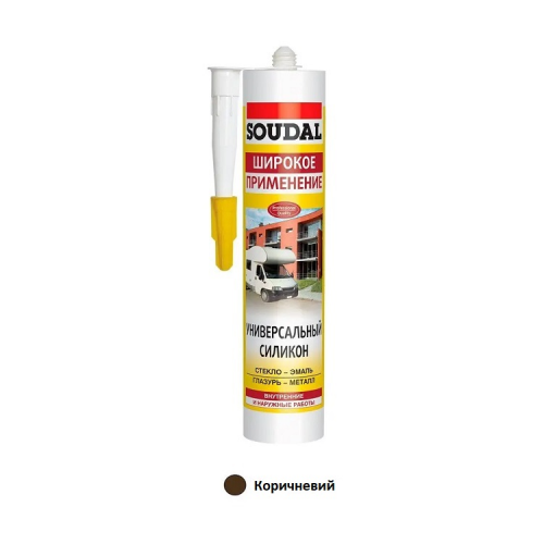 Герметик універсальний силіконовий SOUDAL 300мл коричневий - однокомпонентний еластичний герметик кислотного отвердіння. Відмінна адгезія до шорстких і гладких поверхонь, у тому числі до цегли, дерева, санітарної кераміки, скла. Не використовувати до ПВХ та акрилів, також при склінні вікон пофарбованих акриловими фарбами.
