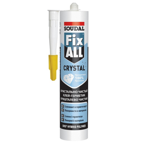 Герметик-клей Soudal FIX ALL CRYSTAL прозорий 290мл - постійно еластичний ідеально прозорий універсальний клей-герметик з нейтральним отвердінням на основі SMX-полімера. Відмінна адгезія до різних будівельних матеріалів. Можна використовувати навіть на вологих поверхнях. Без запаху, не містить розчинників, стійкий до дії багатьох хімічних речовин - слабких кислот, лугів, розчинників і олив. Після затвердіння можна фарбувати - також водними фарбами. Стійкий до впливу атмосферних умов та ультрафіолетового випромінювання.