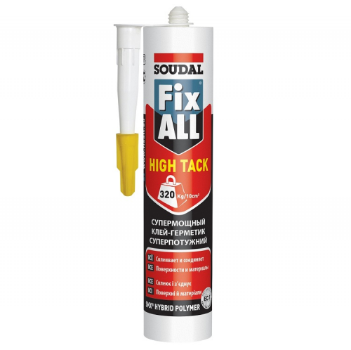 Герметик-клей FIX ALL HIGH TACK білий 290мл - постійно еластичний універсальний клей-герметик з дуже великою початковою клейкістю на основі SMX гібридних полімерів. Відмінна адгезія до різних будівельних матеріалів. Можна використовувати навіть на вологих поверхнях. Без запаху, не містить розчинників, стійкий до дії багатьох хімічних речовин: слабких кислот, лугів, розчинників та олив. Після затвердіння можна фарбувати, також водними фарбами. Стійкий до впливу атмосферних умов і ультрафіолетового випромінювання.