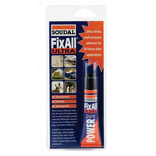 Герметик-клей гібридний Soudal FIX ALL ultra 20мл - хімічно нейтральний еластичний клей з екстремальною силою склеювання для зовнішнього і внутрішнього застосування. Постійно еластичний після затвердіння, стійкий до вібрацій, вологості, аліфатичних розчинників, мінеральних масел, жирів, слабких кислот і лугів. Переносить великі коливання температури. Короткий час затвердіння, можливість навантаження через 90 хвилин. Безбарвний, без запаху, не містить розчинників. Ефективно скріплює нерівні і не підходящі за формою елементи, можна застосовувати для заповнення відламаних шматків матеріалу.