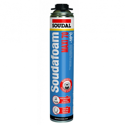 Піна монтажна зимова SOUDAFOAM MAXI 70 -10°C - з газом-витіснювачем, що не містить CFC – однокомпонентна, саморозширювальна, готова до застосування поліуретанова піна з насадкою для використання з пістолетом. Газ-витіснювач абсолютно нешкідливий для озонового шару. Піна Soudafoam Maxi 70 Winter була розроблена для застосування за температури до -10˚С. Колір: світло-жовтий.