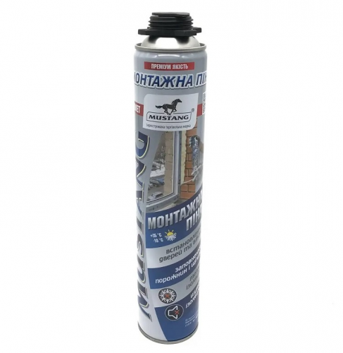 Піна монтажна MUSTANG п/п 850мл - однокомпонентна поліуретанова монтажна піна має досконалу адгезію з усіма будівельними матеріалами. Стійка до старіння, плісняви і вологи. Ідеальна рівномірна дрібнопориста структура готової піни та її щільна консистенція дозволяють якісно герметизувати монтажні шви, домагаючись високої тепло і звукоізоляції.