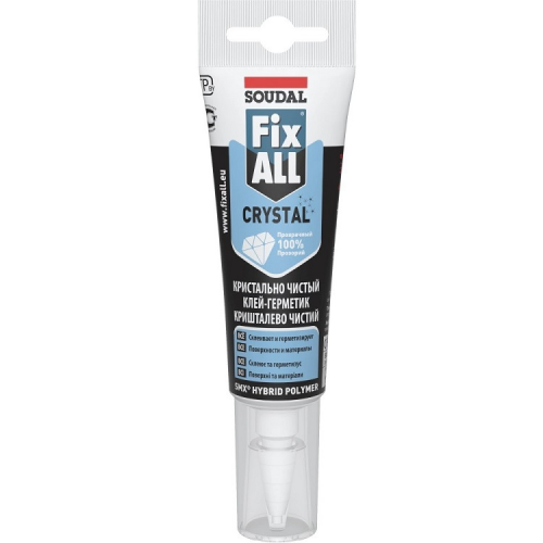 Герметик-клей Soudal FIX ALL CRYSTAL прозорий 125мл - постійно еластичний ідеально прозорий універсальний клей-герметик з нейтральним отвердінням на основі SMX-полімера. Відмінна адгезія до різних будівельних матеріалів. Можна використовувати навіть на вологих поверхнях. Без запаху, не містить розчинників, стійкий до дії багатьох хімічних речовин - слабких кислот, лугів, розчинників і олив. Після затвердіння можна фарбувати - також водними фарбами. Стійкий до впливу атмосферних умов та ультрафіолетового випромінювання.