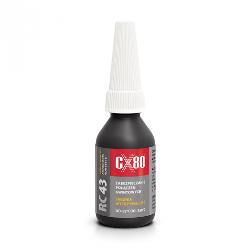 Анаеробний клей RC43 для захисту металевих різьбових з'єднань із середньою силою з'єднання. Пов'язує при контакті з металевими поверхнями при відсутності доступу до повітря. Застосовується клей RC43 для блокування болтів і гайок, герметизації, захисту різьблення від відгвинчування під час вібрації. Рекомендується спеціально для невеликого різьблення (діаметр різьби - до M36). Властивості: Середня міцність. Захист від корозії. Стійкість до вібрацій. Збільшення сили тиску і ковзання для полегшення установки. Початкове зв'язування: до 15 хвилин. Повна міцність: через 24 години. Термостійкість: від -55 °C до + 150 °C. Видалення за допомогою ручних інструментів.