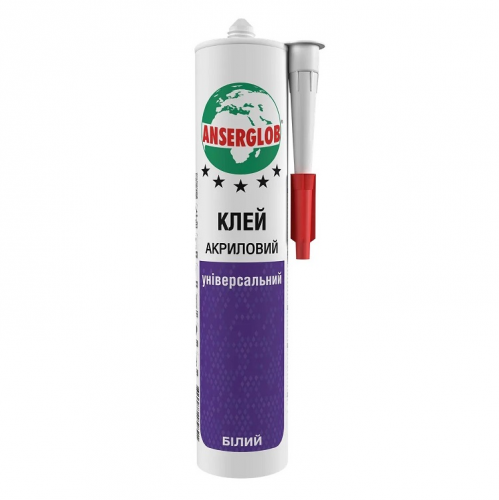 Клей акриловий універсальний ANSERGLOB - призначений для ремонтних та опоряджувальних робіт. Використовується для склеювання більшості будівельних матеріалів, таких як, дерево, деревоподібні матеріали, декоративні та фінішні вироби з твердого ПВХ, гіпсокартон, пінополістирол, цегла, гіпс, бетон, штукатурка, натуральний камінь, керамічна плитка тощо. Підходить для вологих приміщень (кухні, душові, мийні відділення, громадські санвузли та ін.). Застосовується для внутрішніх та зовнішніх робіт. Має швидке початкове схоплювання. Після твердіння утворюється вологостійкий, еластичний шов. Надалі клей можна фарбувати.