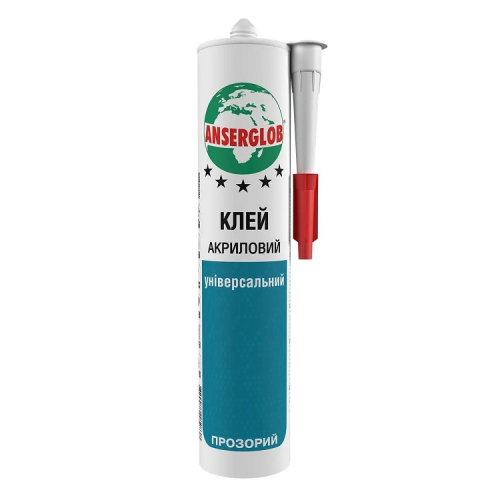 Клей акриловий універсальний прозорий ANSERGLOB - прозорий призначений для склеювання більшості водопоглинаючих будівельних матеріалів, таких як, дерево, деревоподібні матеріали, гіпсові й поліуретанові карнизи, термо- і звукоізоляційні матеріали, декоративні та фінішні вироби з твердого ПВХ, полістирол, цегла, керамічна плитка тощо. Підходить для вологих приміщень (кухні, душові, мийні відділення, громадські санвузли та ін.). Застосовується для зовнішніх та внутрішніх робіт. Після твердіння утворюється вологостійкий, еластичний прозорий шов. Надалі клей можна фарбувати. Одна з поверхонь повинна бути водо поглинаючою, інша може бути неводопоглинаюча.