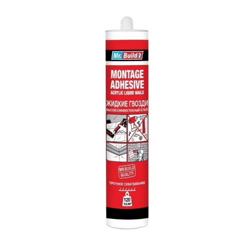 Клей акриловий Mr. Build MONTAGE ADHESIVE - однокомпонентний клей-герметик, з високоякісної акрилової емульсії, спеціальних наповнювачів та добавок. Продукт легко наноситься та ефективно склеює вироби, такі як карнизи, зроблені з дерева, поліуретану, полістиролу, гіпсу та інше. MR. BUILD MONTAGE ADHESIVE позбавляє фіксації за рахунок використання дриля та кріпильних виробів, що надає естетичнішого вигляду при складанні конструкції. Початкова швидкість схоплювання, разом із швидким затвердінням та оптимальною силою зчеплення суттєво полегшують роботу з монтажу. Клей-герметик також можна використовувати для закладення швів між панелями карниза та між карнизом та стіною. Продукт легко фарбується. Має низький вміст літаючих органічних речовин та відповідає вимогам екологічно чистого будівництва. MR. BUILD MONTAGE ADHESIVE не містить азбест, тим самим не негативно впливає на пластик і не викликає корозію металу. Не має негативного впливу на шкіру людини.