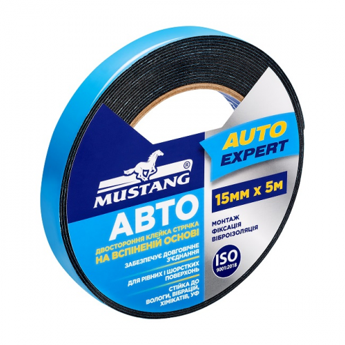 Стрічка двостороння на вспіненій основі АВТО 15мм MUSTANG FTA155 складається зі зміцненого носія на основі спіненого поліетилену чорного кольору на який з обох боків нанесений клей.
