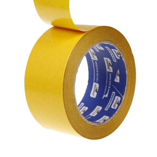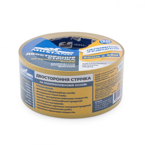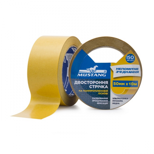 Стрічка двостороння 50мм MUSTANG DPP5010 на поліпропіленовій основі складається з міцної плівкової основи прозорого кольору на яку з обох сторін нанесений клейовий шар на основі синтетичного каучуку.
