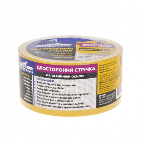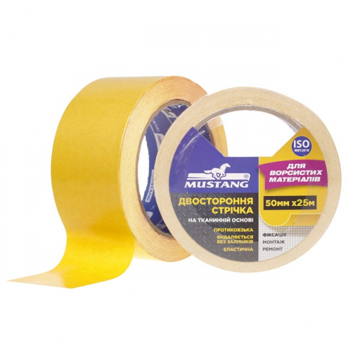 Стрічка двостороння 50мм MUSTANG DCT5025 на тканинній основі складається зі спеціальної армованої поліпропіленової тканини білого кольору на яку з обох сторін нанесений клейовий шар на основі синтетичного каучуку. Клейова основа забезпечує відмінну клейкість до ворсяних, волокнистих, вовнистих, шкіряних, металевих, дерев’яних, пластикових та інших матеріалів. Має високий рівень стійкості до стирання та механічних зрушень. При короткостроковому використанні, завдяки надміцній армованій основі, стрічка видаляється з поверхні єдиною цілісною смугою без залишків клею. Стрічка призначена для горизонтального та вертикального кріплення всередині приміщень.